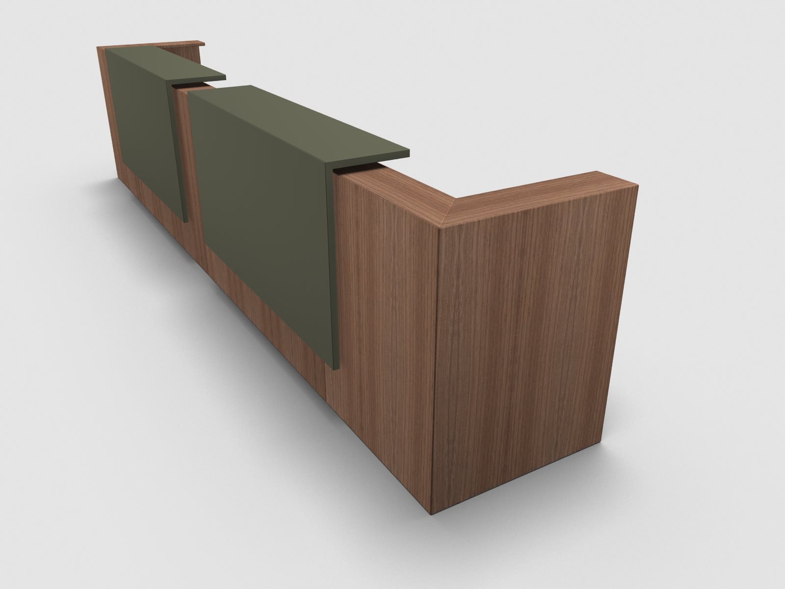Quadrifoglio Z2 Empfangstheke C22 Walnuss 485cm Blende:Lack/gruen Gestell:silbern