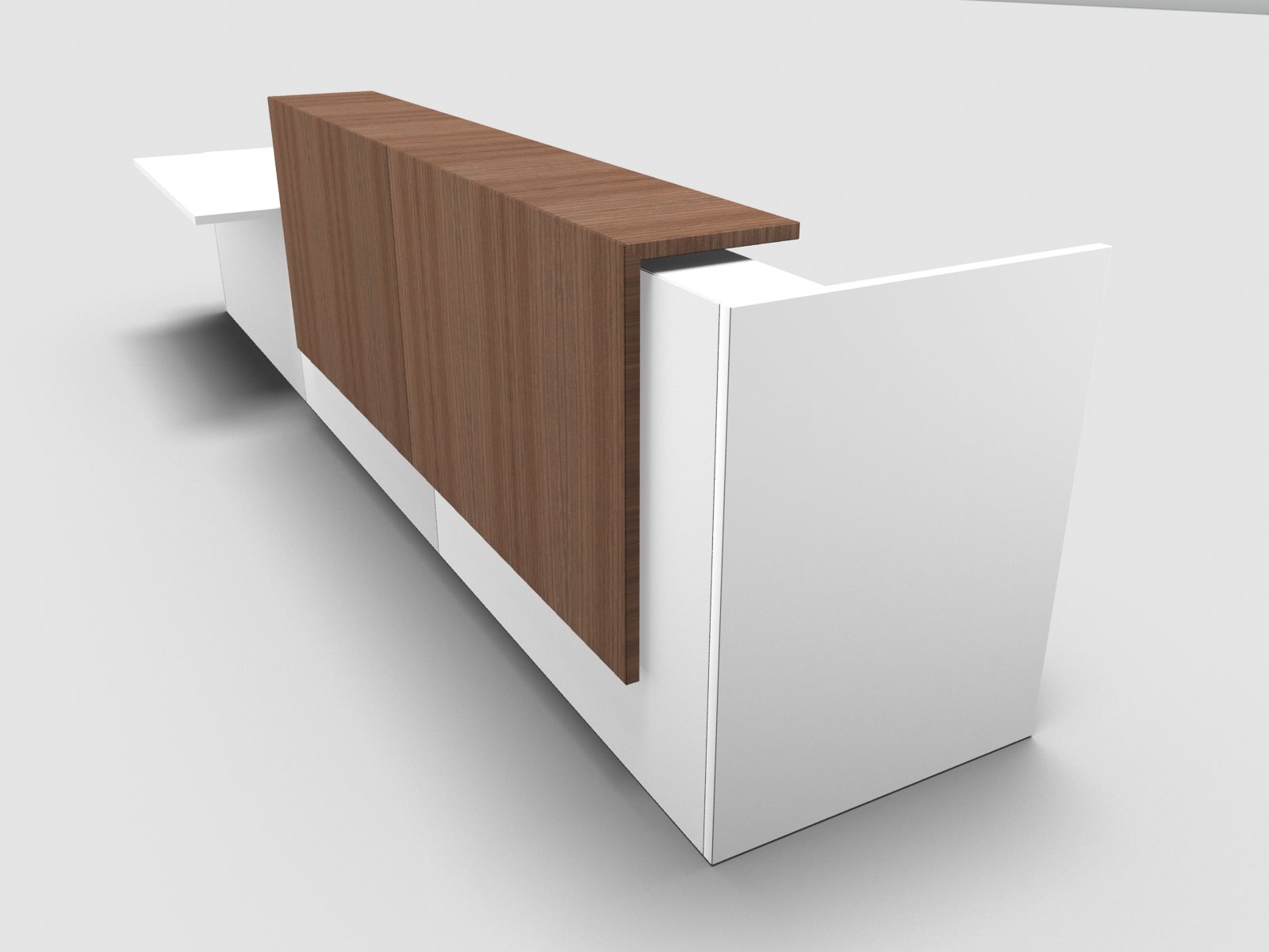 Quadrifoglio Z2 Empfangstheke C50 Walnuss 426cm Tisch:rechts Blende:Walnuss Gestell:weiss