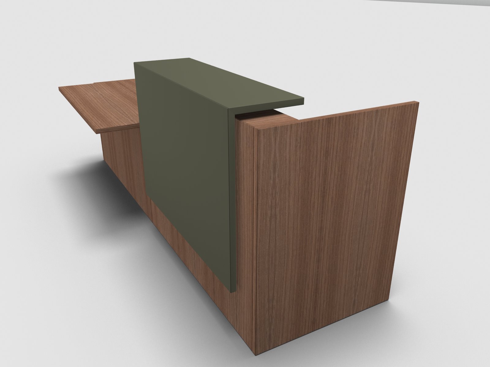 Quadrifoglio Z2 Empfangstheke C57 Walnuss 286cm Tisch:rechts Blende:Lack/gruen Gestell:silbern
